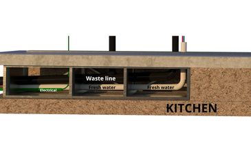 Una caja multiservicios de Keyponents para cocina. Estas cajas suelen incluir conexiones eléctricas, tuberia de drenaje, tuberia de agua potable, permitiendo una mayor funcionalidad en espacios como cocinas u oficinas.