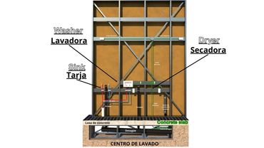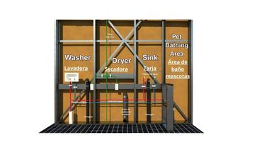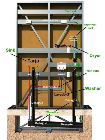 Nuestro montaje de pared para lavandería es una solución modular totalmente integrada diseñada para mejorar la eficiencia, la comodidad y el atractivo estético. Diseñadas para aplicaciones residenciales y comerciales, estas paredes prefabricadas vienen con sistemas de plomería, electricidad y ventilación preinstalados, simplificando la instalación y reduciendo los costos de mano de obra.
